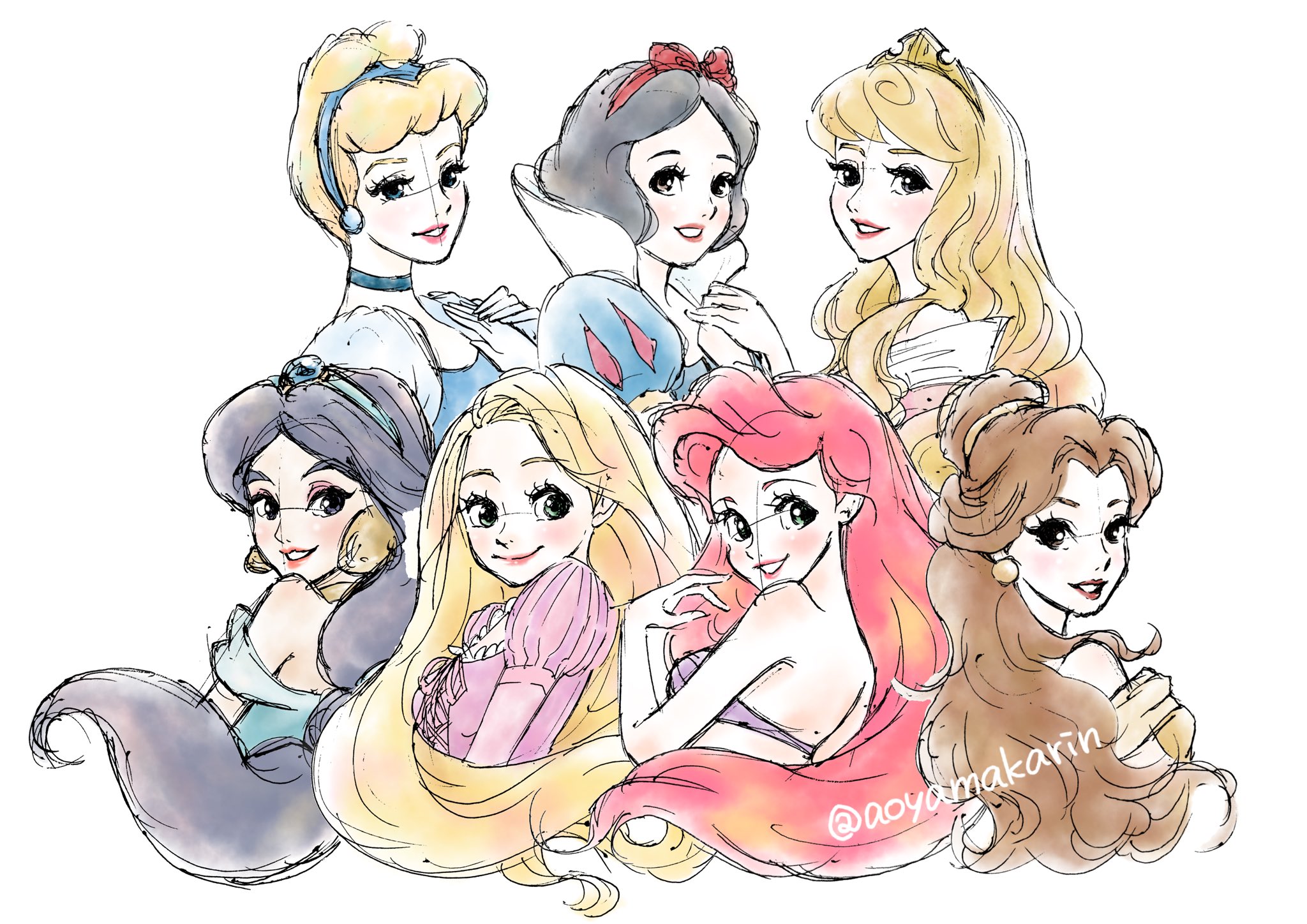 青山かりん イラストレーター ディズニープリンセス集合 7姫 白雪姫 シンデレラ オーロラ姫 アリエル ベル ジャスミン ラプンツェル ディズニー ディズニープリンセス イラスト プリンセス イラスト 姫 Disney ディズニー好きな人と